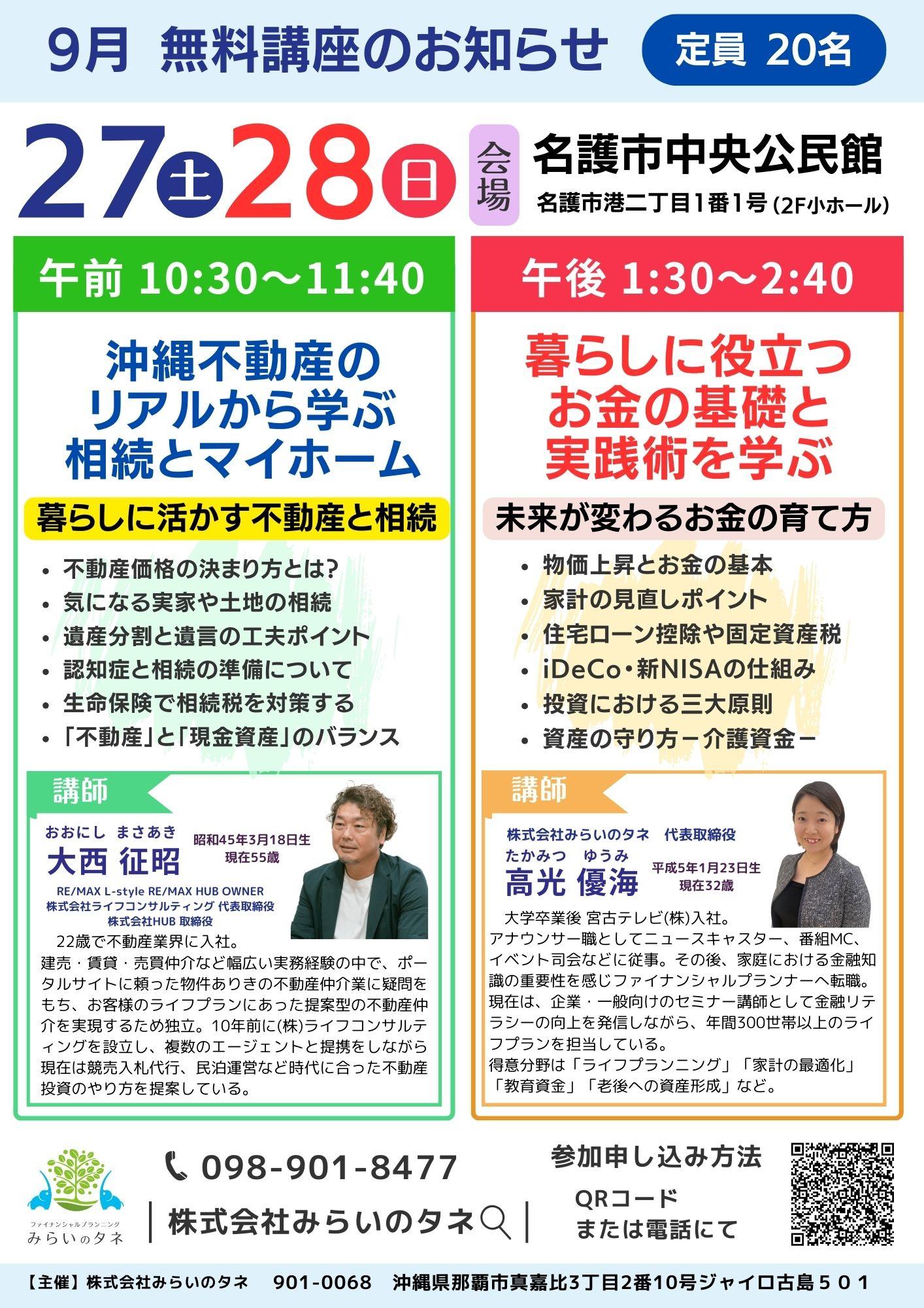 9月27日(土)・28日(日)、名護中央公民館で、無料セミナー開催! 「不動産相続」と「資産形成」について講座いたします。知識を身につけ、賢く未来に備えましょう。 無料個別相談のご予約もできるので、自分に合った人生設計を後日ゆっくり相談できます。